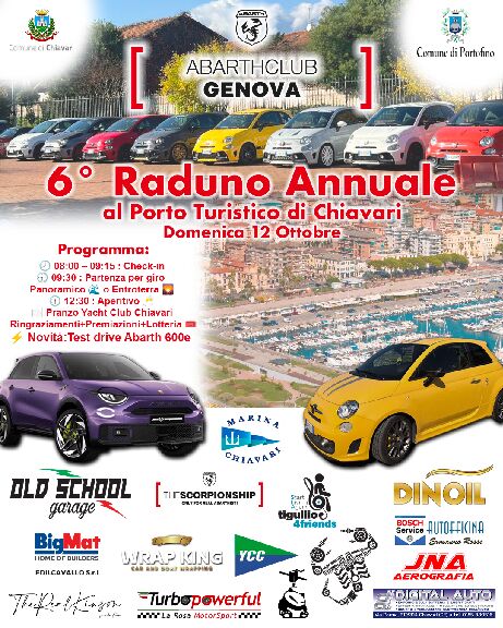 Domenica 12 ottobre, il Porto Turistico si terrà  il sesto Raduno Abarth, un evento ufficiale dedicato agli appassionati del celebre marchio automobilistico. si trasformerà in un palcoscenico dinamico per celebrare la tradizione, lo stile e le prestazioni delle vetture dello Scorpione. L’iniziativa, patrocinata dal Comune di Chiavari, promuove la cultura motoristica e valorizza il territorio attraverso una giornata di aggregazione.