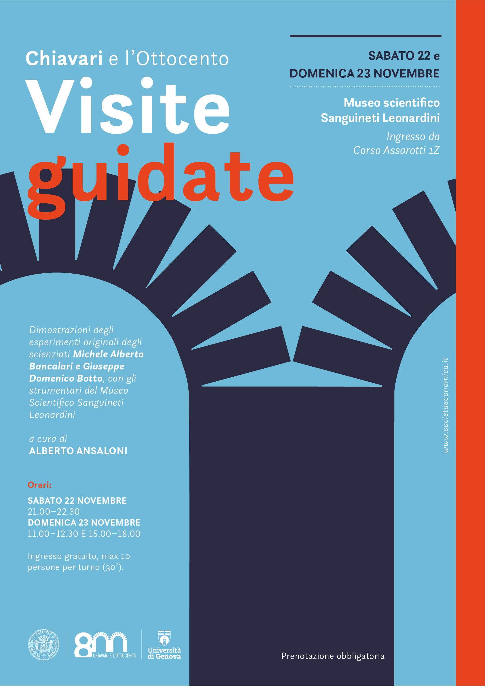 Durante il weekend inaugurale della Rassegna “Chiavari e l’Ottocento. Il secolo che ha cambiato il volto della città”, Sabato 22 e domenica 23 novembre, dalle ore 21.00 alle ore 22,30, il Museo Scientifico Sanguineti-Leonardini, presso il Seminario Vescovile ( ingresso da Via Assarotti), aprirà eccezionalmente le porte per visite guidate e dimostrazioni sperimentali, riproponendo esperimenti dei fisici dell’800 utilizzando gli strumenti d’epoca del museo. Le visite guidate avranno una durata di 30 minuti e prevedono gruppi di al massimo 10 persone. Prenotazioni su-https://340st.r.a.d.sendibm1.com/mk/cl/f/sh/SMK1E8tHeFuBoPrySh968D4vY1j7/Z7z904nnOen4