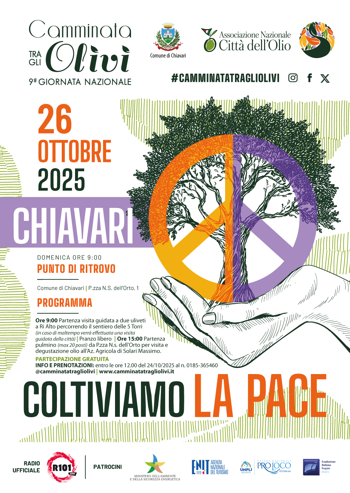 Domeenica 26 Ottobre si terrà la 9° Giornata Nazionale della Camminata tra gli Olivi organizzata dal Comune di Chiavari nell’ambito dell’adesione all’Associazione Nazionale Città dell’Olio.