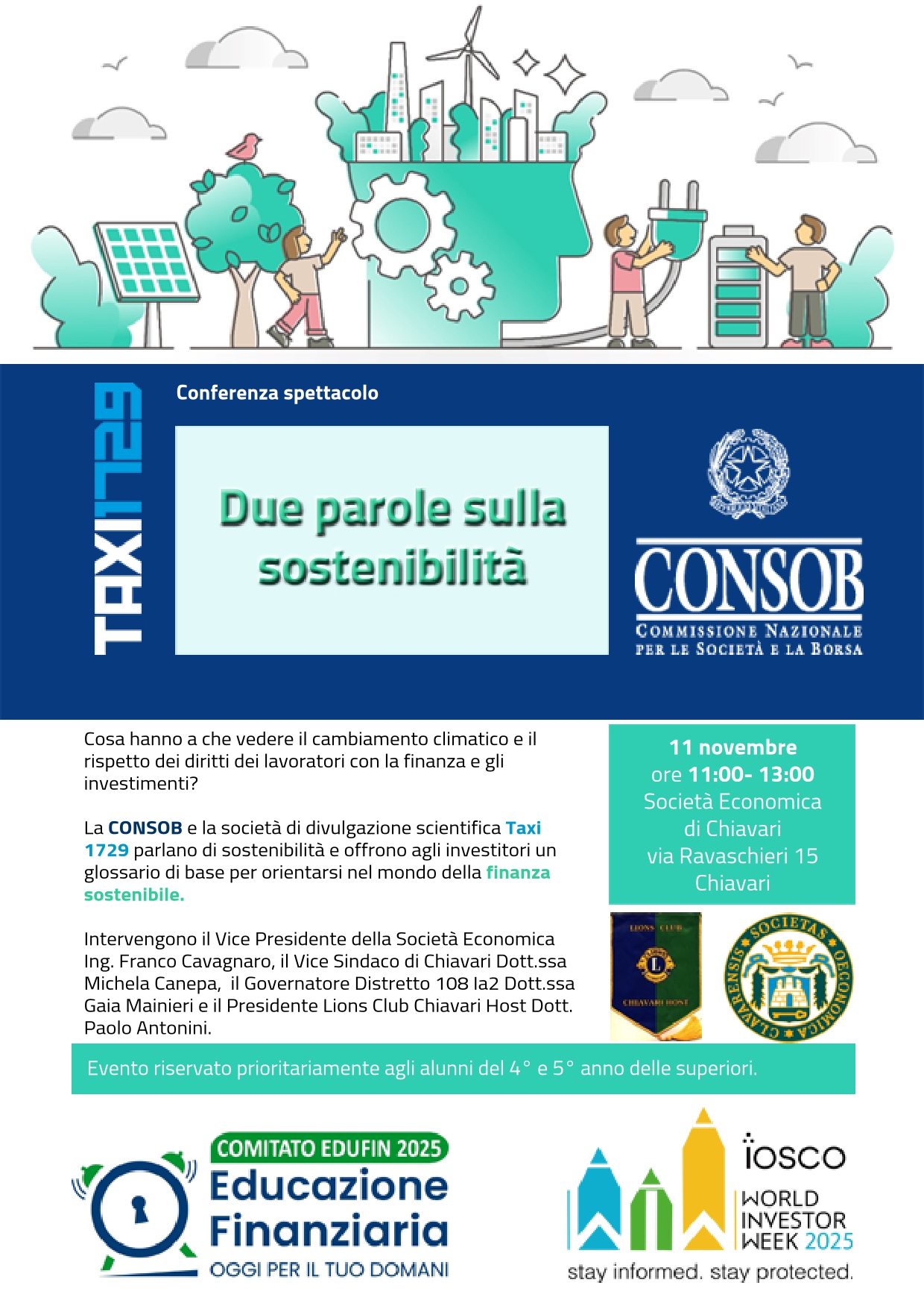Appuntamento martedì 11 novembre in Società Economica dalle 11 alle 13. –  “Cosa hanno a che vedere il cambiamento climatico e il rispetto dei diritti dei lavoratori con la finanza e gli investimenti”? La CONSOB e la società di divulgazione scientifica Taxi 1729 parlano di sostenibilità e offrono agli investitori un glossario di base per orientarsi nel mondo della finanza sostenibile. – Intervengono il Vice Presidente della Società Economica Ing. Franco Cavagnaro, il Vice Sindaco di Chiavari Dott.ssa Michela Canepa, il Governatore Distretto 108 Ia2 Dott.ssa Gaia Mainieri e il Presidente Lions Club Chiavari Host Dott. Paolo Antonini.