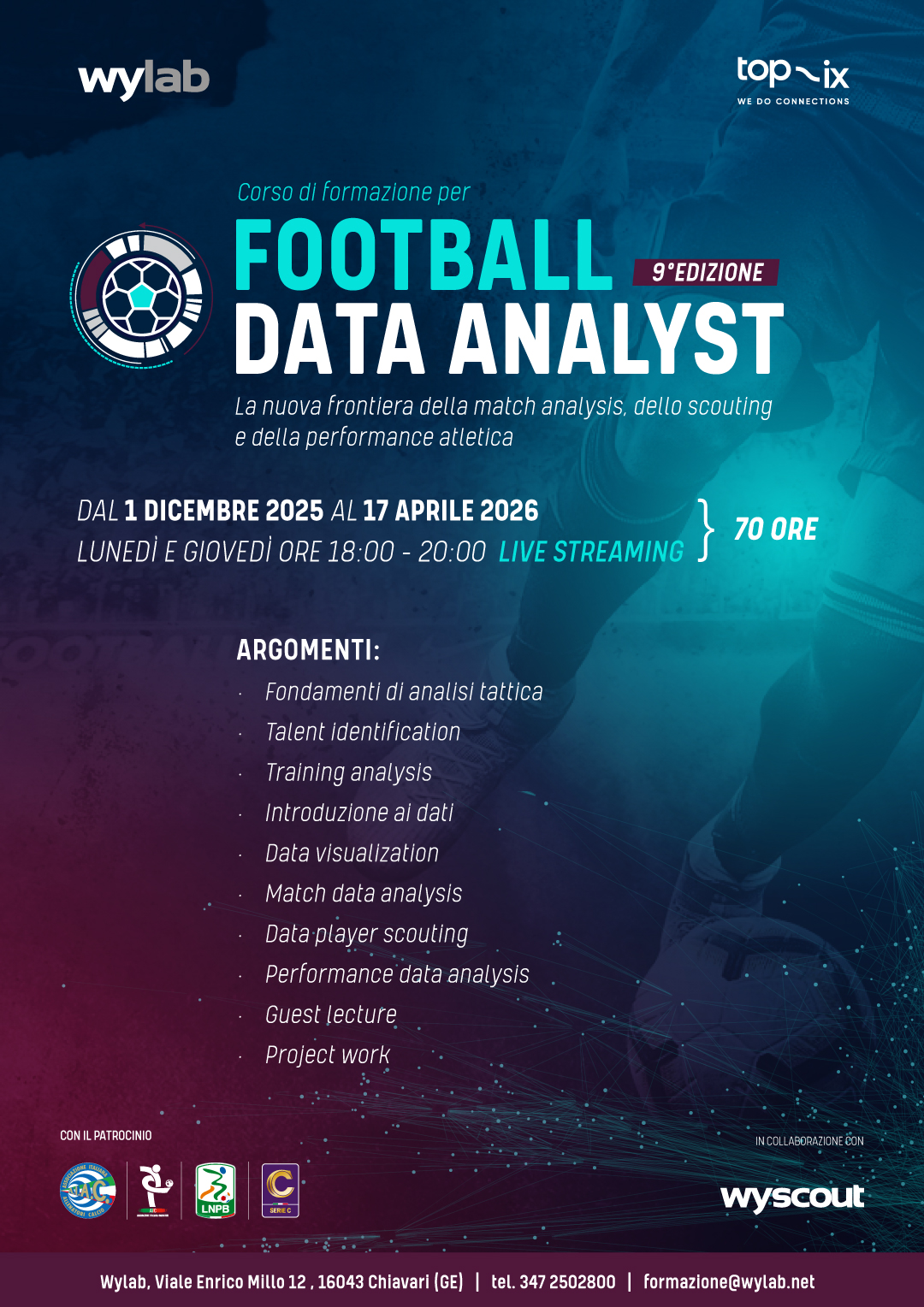 Con oltre 180 corsisti formati e più di 400 ore di formazione erogate, Football Data Analyst, giunto alla 9° edizione, è il corso di punta dell’Academy di Wylab: il corso è finalizzato a formare figure professionali in grado di gestire, analizzare ed estrarre valore dalla grande quantità di dati evento e dati fisico-atletici a disposizione dei club, per migliorare la match analysis, il player scouting e la performance atletica. – Saper raccogliere, organizzare e gestire basi dati disomogenee e rendere evidenti i risultati ottenuti grazie a semplici visualizzazioni può diventare un punto di forza essenziale per società calcistiche desiderose di migliorare le performance atletiche, tecniche e tattiche individuali o di squadra, lo studio degli avversari e la valutazione e recruitment dei calciatori. Lavorando a contatto con Match Analyst, Video Analyst, Scout e Preparatori Atletici, il Football Data Analyst completa il cerchio perfetto della società calcistica 4.0.