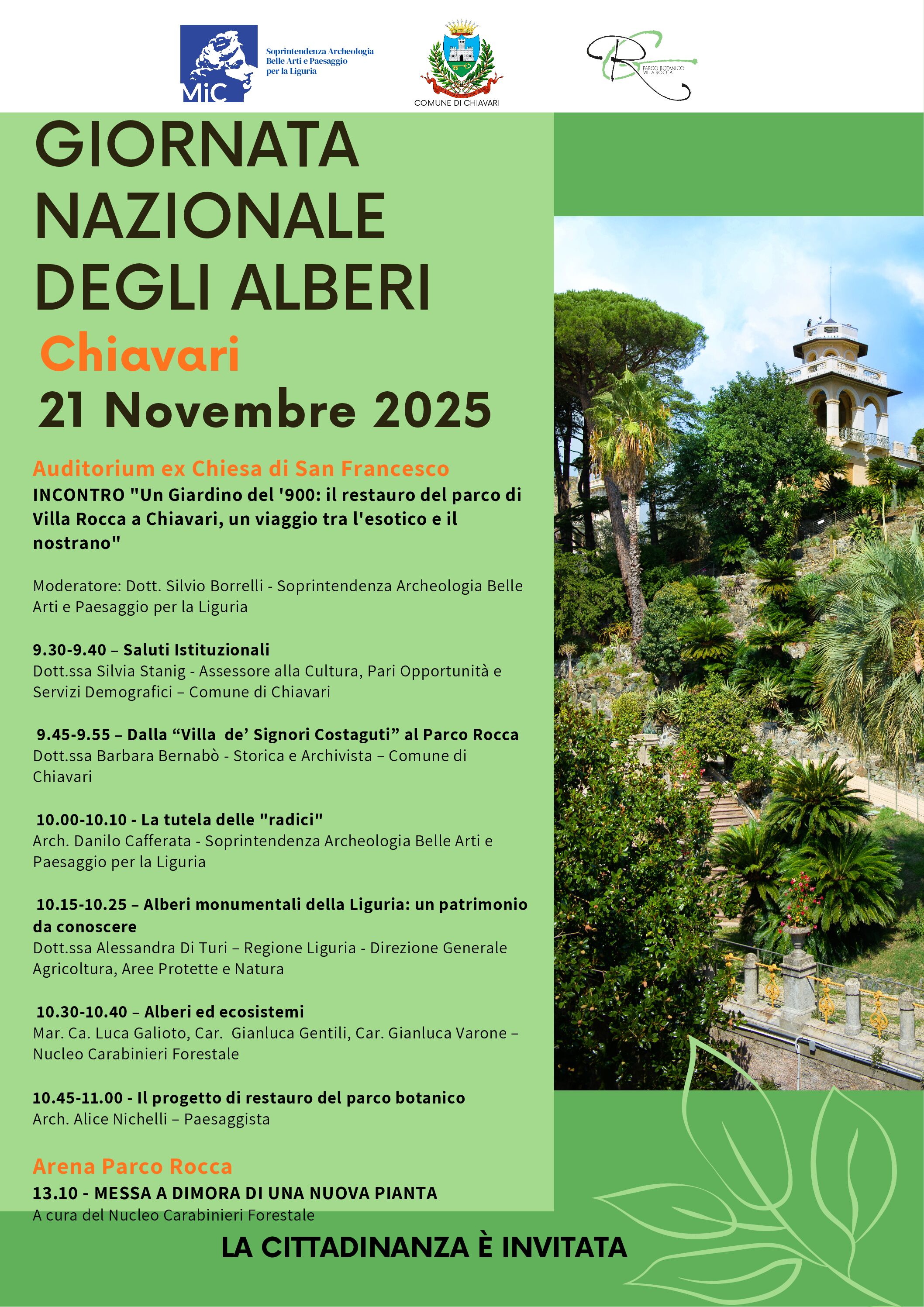 Anche quest’anno sarà celebrata la Giornata Nazionale degli Alberi, il giorno 21 novembre 2025. I diversi incontri a tema si terranno, come da locandina, al mattino presso l’Auditorium ex Chiesa di San Francesco, al pomeriggio ore 13:10 presso l’Arena di Parco Rocca. L’evento è gratuito e aperto al pubblico.