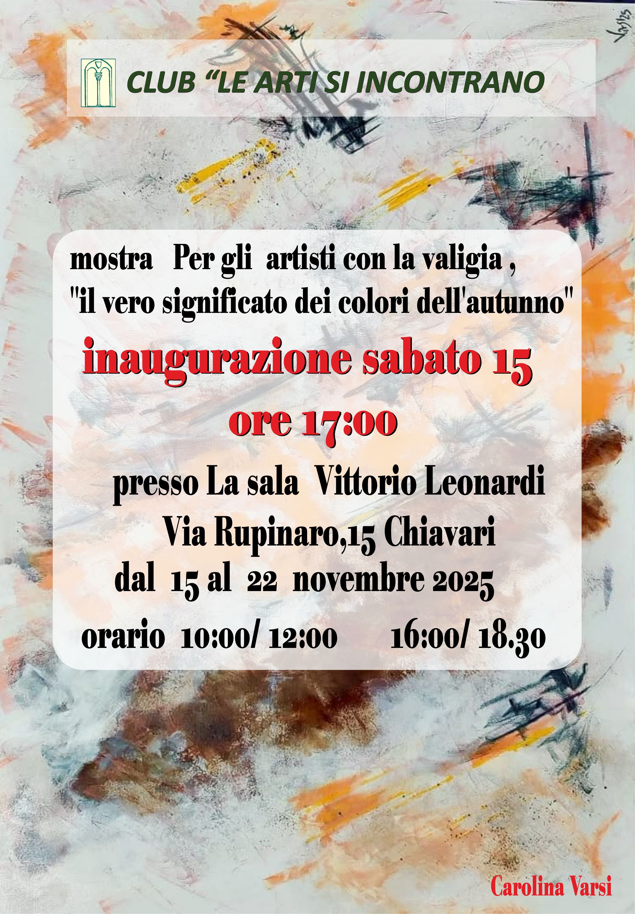 Il Club ” Le arti si incontrano” sabato 15 novembre alle ore 17,00 presso la Sala Vittorio Leonardi Via Rupinaro 15, inaugurerà la mostra per gli Artisti con la Valigia – “Il vero significato dei colori dell’autunno”. La mostra resterà visitabile fino al 22 novembre. Orari: 10 – 12 e 16 – 18,30.