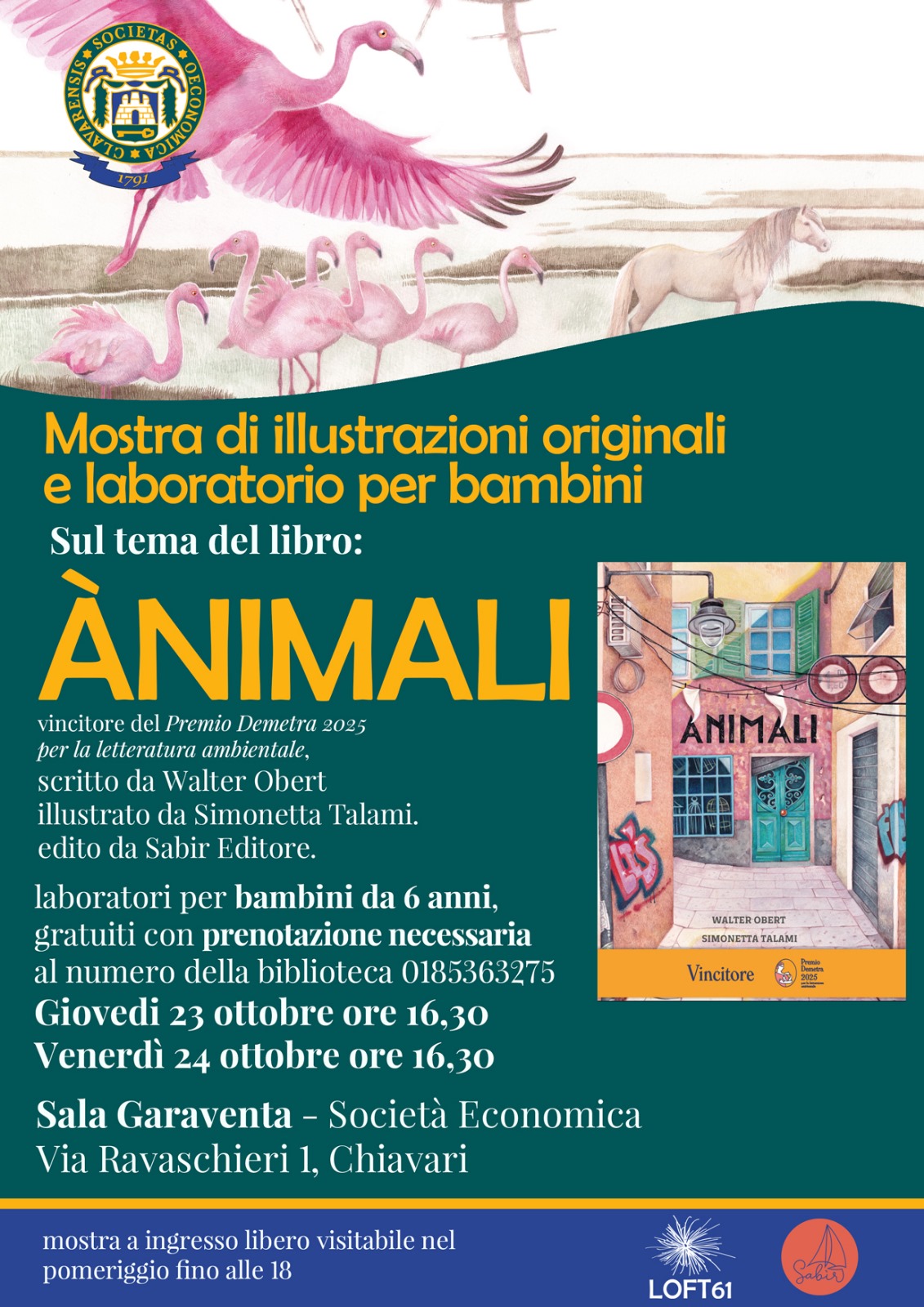 La Società Economica di Chiavari propone un doppio appuntamento per approfondire il mondo dell’albo illustrato e per presentare il libro Ànimali, vincitore del Premio Demetra 2025 per la letteratura ambientale, scritto da Walter Obert, illustrato da Simonetta Talami ed edito da Sabir Editore.
