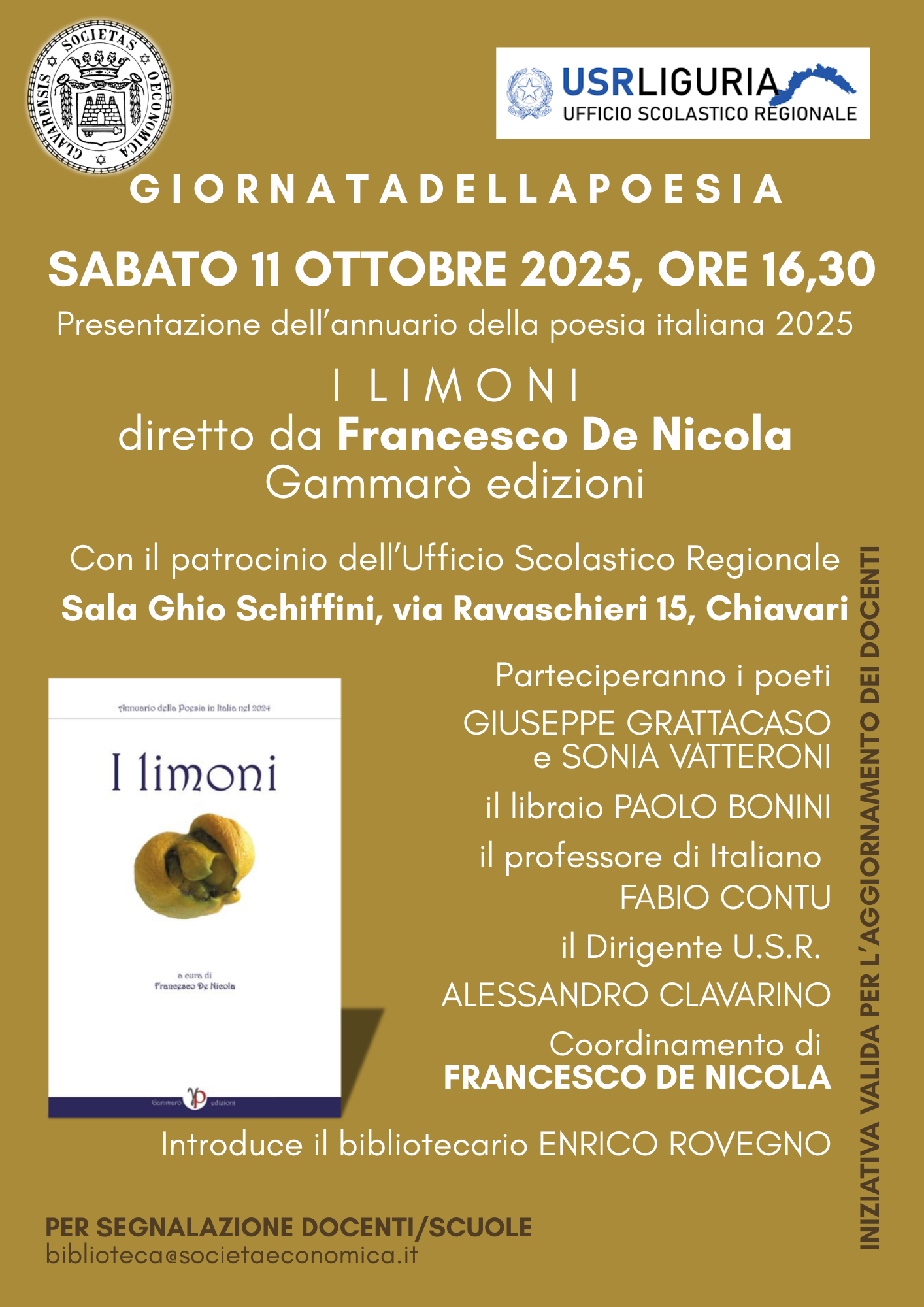 L’appuntamento, che ha il coordinamento di Francesco De Nicola, prevede la partecipazione dei poeti Giuseppe Grattacaso e Sonia Vatteroni, del libraio Paolo Bonini, del professore di italiano Fabio Cantu e del dirigente dell’ufficio scolastico regionale Alessandro Clavarino. Ad introdurre il pomeriggio sarà il responsabile della Biblioteca della Società Economica Enrico Rovegno.