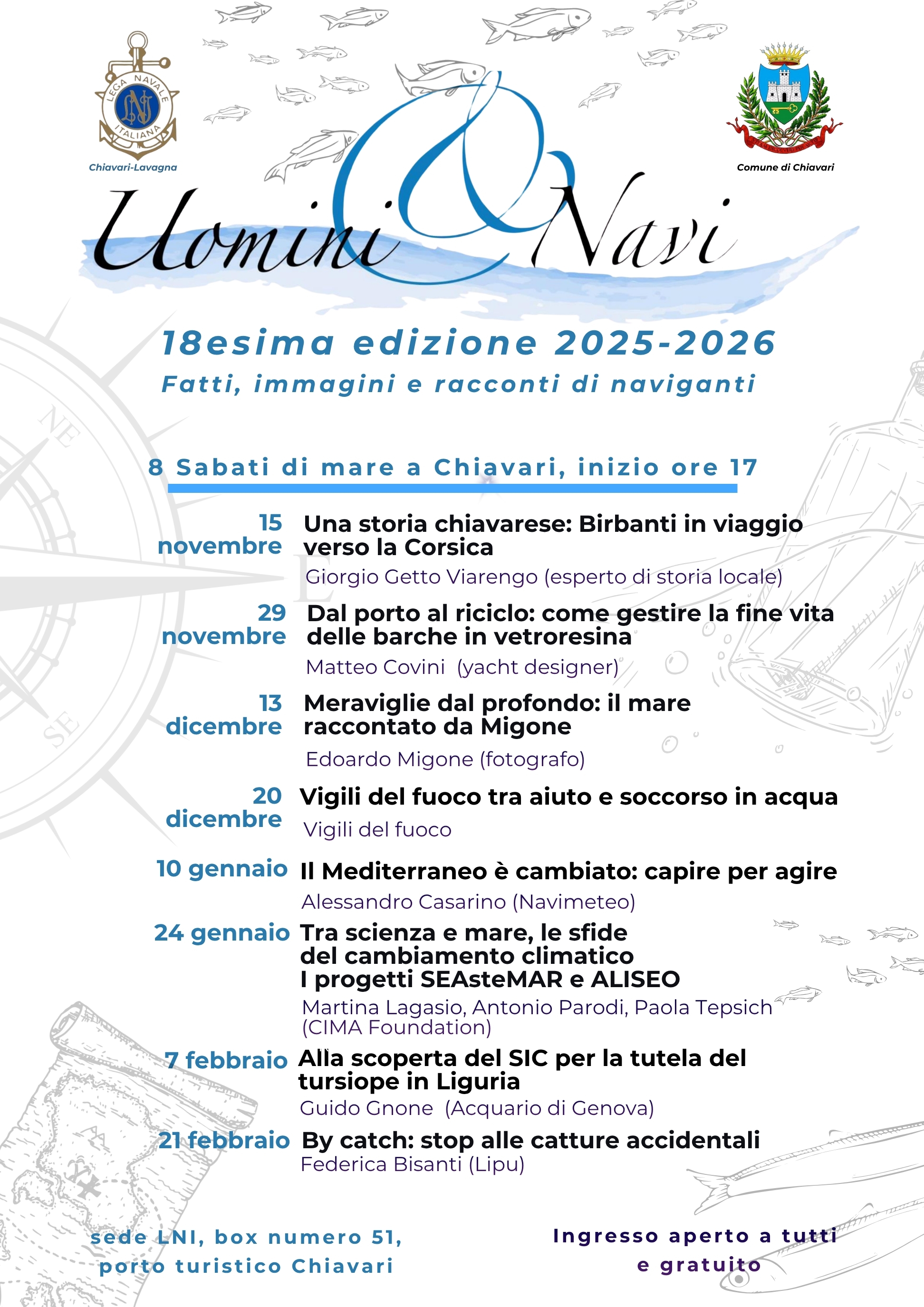 Ritorna a Chiavari “Uomini e Navi”, la rassegna dedicata alle storie delle persone e del mare, organizzata da Lega Navale Italiana sezione Chiavari-Lavagna, presieduta da Umberto Verna, con il patrocinio del Comune di Chiavari e la collaborazione di Marina Chiavari, Acquario Costa, Centro Studi Tradizioni Nautiche e Liguria Together. – Otto incontri fra novembre 2025 e febbraio 2026 previsti il sabato alle 17.00 nella sede della Lega Navale al Porto turistico di Chiavari (box numero 51, Porto Turistico di Chiavari).