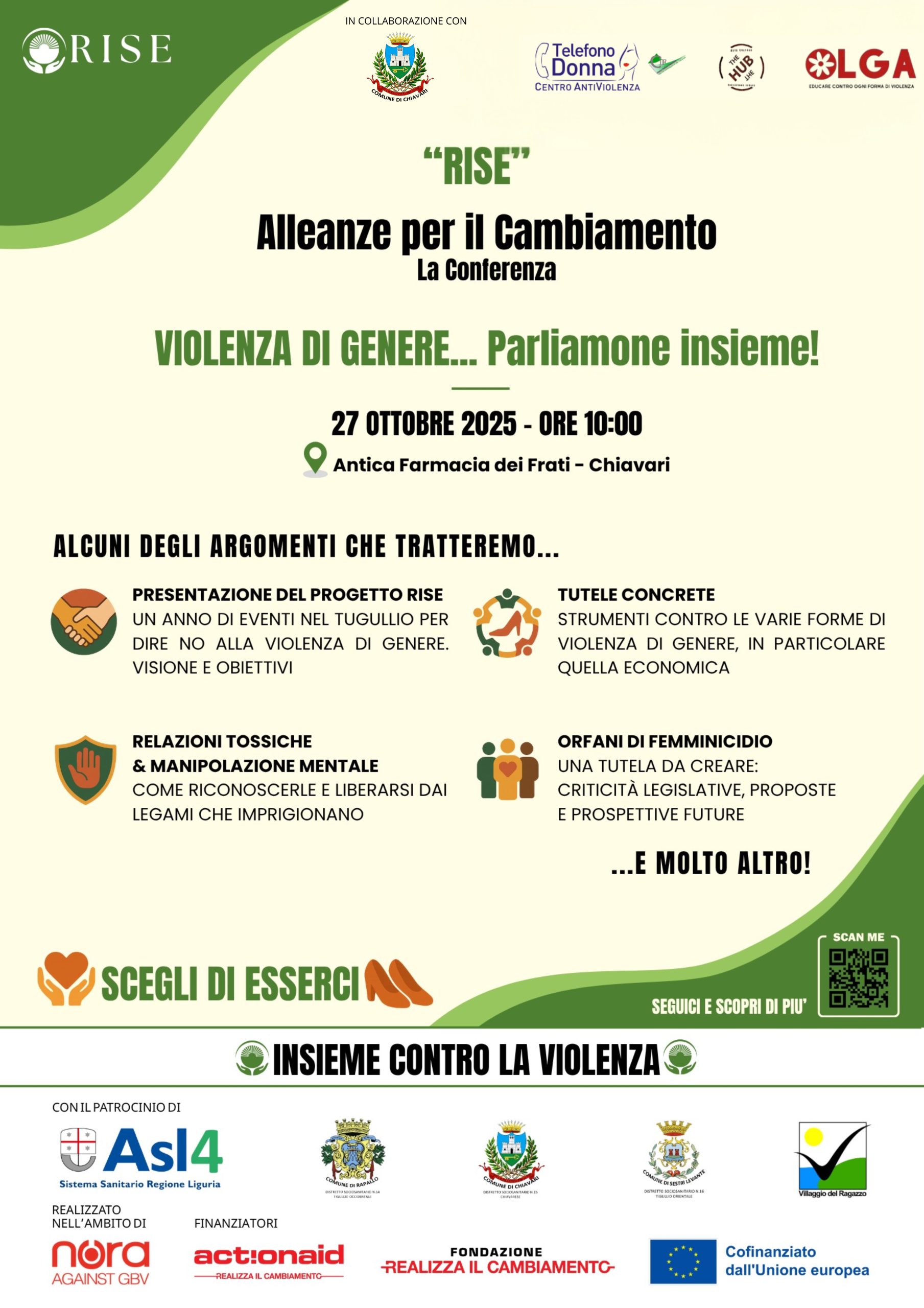 Lunedì 27 ottobre 2025, ore 10.30 – Presso l’Antica Farmacia dei Frati (Via Entella 7, Chiavari) si terrà la conferenza pubblica “RISE – Alleanze per il Cambiamento”, primo appuntamento del progetto “RISE – Riconoscersi, Identificarsi, Sostenersi, Evolvere”. – Il progetto, organizzato il collaborazione con il Comune di Chiavari, Assessorato al Turismo, è promosso dal Telefono Donna Centro Antiviolenza CIF APS in partenariato con THE HUB APS e OLGA APS. – RISE nasce per costruire nel Tigullio una risposta culturale e sociale strutturata alla violenza di genere, attraverso quattro azioni principali: