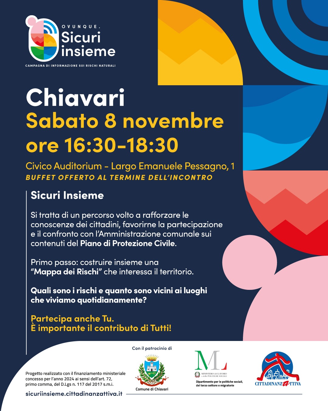 Sabato 8 novembre al Civico Auditorium in Largo Emanuele Pessagno 1, dalle ore 16.30 alle ore 18.30, si svolgerà il primo incontro di un percorso volto a rafforzare le conoscenze dei cittadini, favorirne la partecipazione e il confronto con l’Amministrazione comunale sui contenuti del Piano di Protezione Civile. L’assemblea, aperta a tutta la cittadinanza, è finalizzata a raccogliere le testimonianze e le percezioni di criticità, pericoli, emergenze del ns. territorio da parte delle persone.