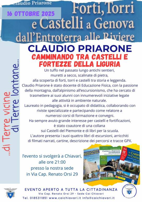 Giovedì 16 ottobre 2025 alle ore 21.00, presso la sede del CAI Chiavari in via Orsi 29, si terrà la serata “Di terre vicine… di terre lontane” con Claudio Priarone, giornalista, scrittore, docente di Educazione Fisica, pedagogo e grande appassionato di escursionismo, montagna, castelli e fortificazioni.